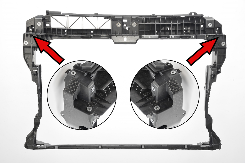 Przednie części do obu SUV-ów produkuje się z polipropylenu w procesie formowania wtryskowego. Miejsce wokół zamka maski zostało wzmocnione cienką wkładką z materiału Tepex dynalite 104‑RG600 o grubości zaledwie jednego milimetra. Matryca do tego kompozytowego półproduktu wykonana jest z polipropylenu i zawiera rowingi z włókien szklanych ciągłych, stanowiące objętościowo 47% materiału. Znajdujące się po obu stronach tej części wsporniki w kształcie litery Z są wzmocnione wcześniej uformowaną wkładką z tego samego materiału kompozytowego.